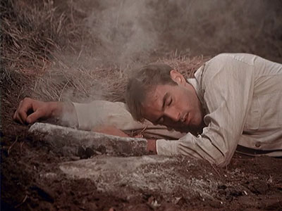 Up on the mountain a man wakes up who made the campfire. He nervously puts out the embers and stops the smoke hoping that no one noticed it.